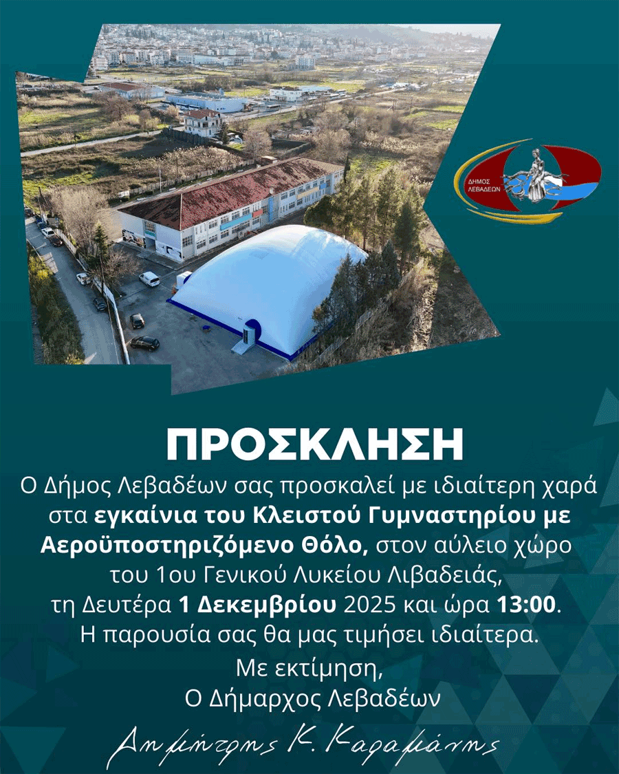 Εγκαίνια στο νέο κλειστό γυμναστήριο Λιβαδειάς με αεροϋποστηριζόμενο θόλο 30 Νοεμβρίου 2025 Ανακοινώσεις Δελτία Τύπου Νέα