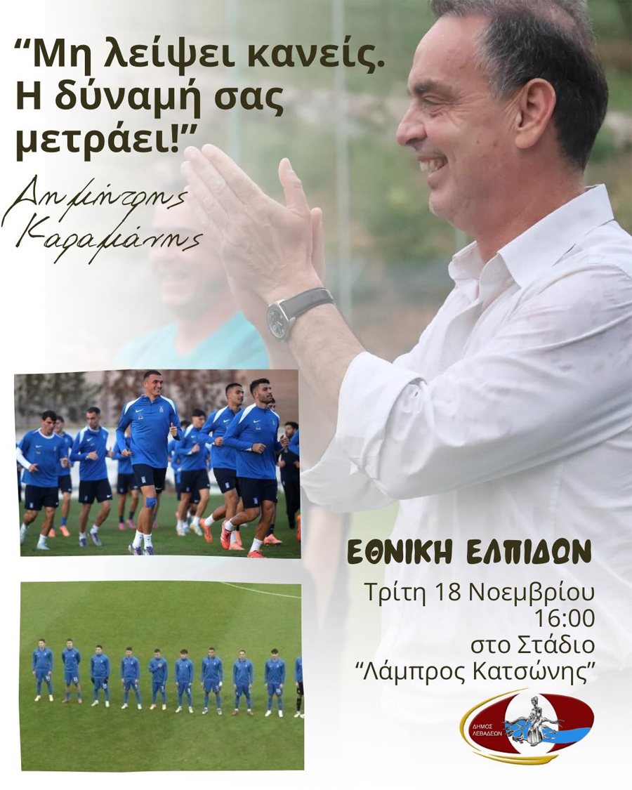 Στηρίζουμε την Εθνική Ομάδα Ελπίδων στον αγώνα με τη Β. Ιρλανδίας στο Δημοτικό Στάδιο Λιβαδειάς «Λάμπρος Κατσώνης» 17 Νοεμβρίου 2025 Ανακοινώσεις Δελτία Τύπου Εκδηλώσεις Νέα