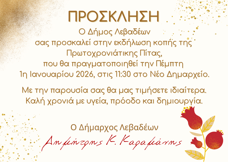 Πρόσκληση στην κοπή της Πρωτοχρονιάτικης πίτας την Πέμπτη 1 Ιανουαρίου 2026 στις 11:30 στο Δημαρχείο