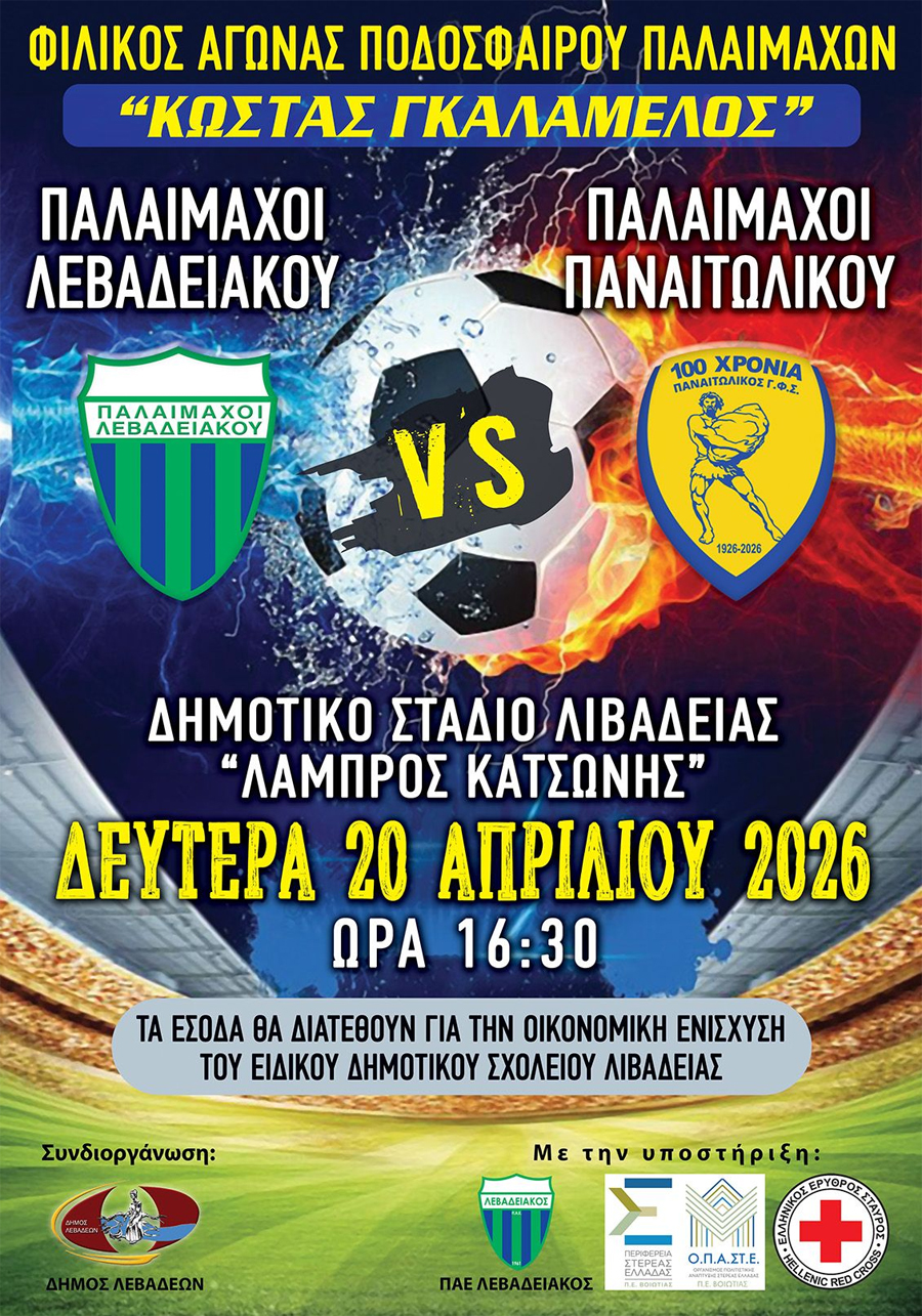 Φιλικός αγώνας παλαιμάχων «Κώστας Γκαλαμέλος»: Παλ. Λεβαδειακού – Παλ. Παναιτωλικού 17 Απριλίου 2026 Αθλητικές Εκδηλώσεις Ανακοινώσεις Δελτία Τύπου Εκδηλώσεις Νέα