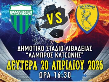 Φιλικός αγώνας παλαιμάχων «Κώστας Γκαλαμέλος»: Παλ. Λεβαδειακού – Παλ. Παναιτωλικού 17 Απριλίου 2026 Αθλητικές Εκδηλώσεις Ανακοινώσεις Δελτία Τύπου Εκδηλώσεις Νέα