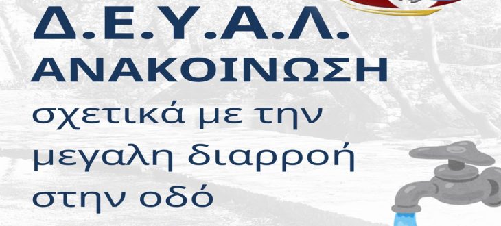 Ενημερώνουμε τους πολίτες ότι σημειώθηκε μεγάλη βλάβη σε κεντρικό αγωγό ύδρευσης Φ160 στην οδό Πλούταρχου, στο ύψος της Εστίας Μητέρας.