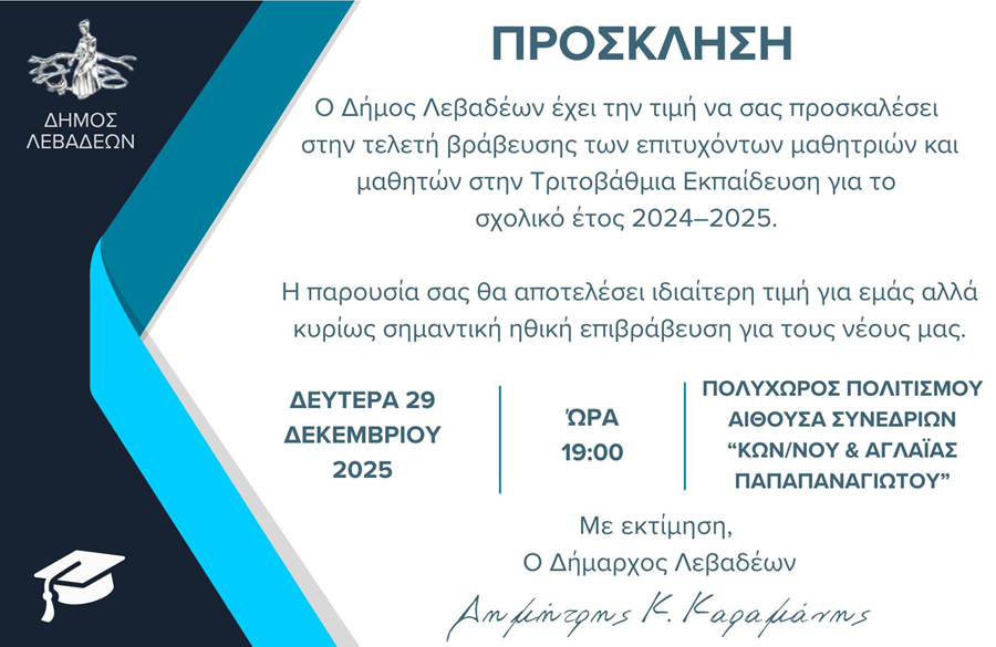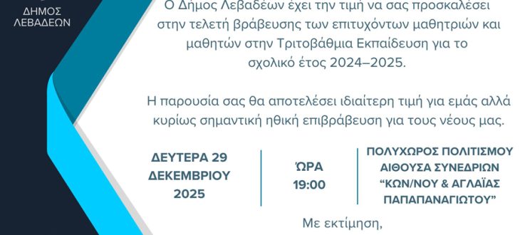 Ο Δήμος Λεβαδέων, στο πλαίσιο της στήριξης και ανάδειξης των προσπαθειών της νέας γενιάς, θα βραβεύσει τους μαθητές και τις μαθήτριες που πέτυχαν την εισαγωγή τους στην Τριτοβάθμια Εκπαίδευση κατά το σχολικό έτος 2024–2025.