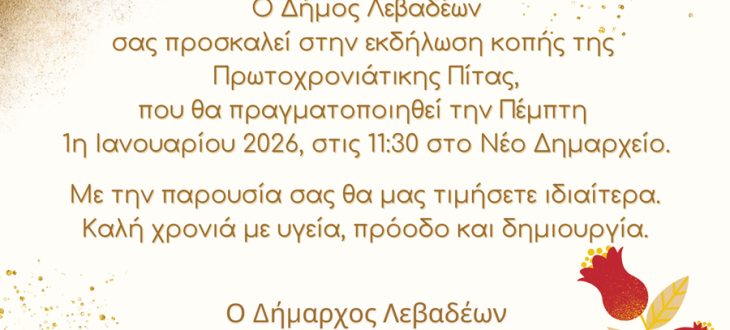 Πρόσκληση στην κοπή της Πρωτοχρονιάτικης πίτας την Πέμπτη 1 Ιανουαρίου 2026 στις 11:30 στο Δημαρχείο