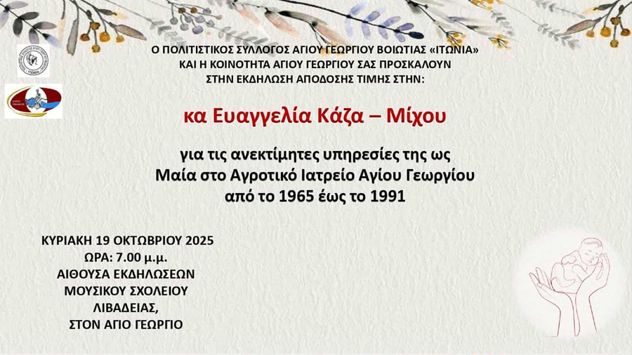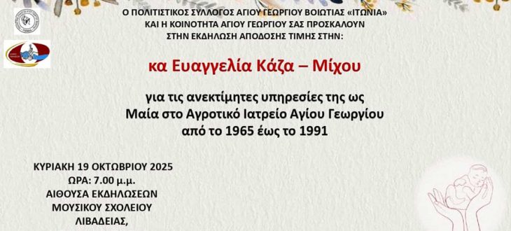 Με σεβασμό και ευγνωμοσύνη την Κυριακή 19 Οκτωβρίου στις 19:00 στο Μουσικό Σχολείο Λιβαδειάς στον Αγ. Γεώργιο αναγνωρίζουμε τη συμβολή της κας Ευαγγελίας Κάζα-Μίχου στην υγεία και τη ζωή της τοπικής κοινωνίας, σε εποχές δύσκολες, όπου η ανθρώπινη παρουσία και το ήθος αποτελούσαν το πιο πολύτιμο εφόδιο.